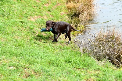 Der Bub apportiert einwandfrei die Ente aus dem Wasser.
